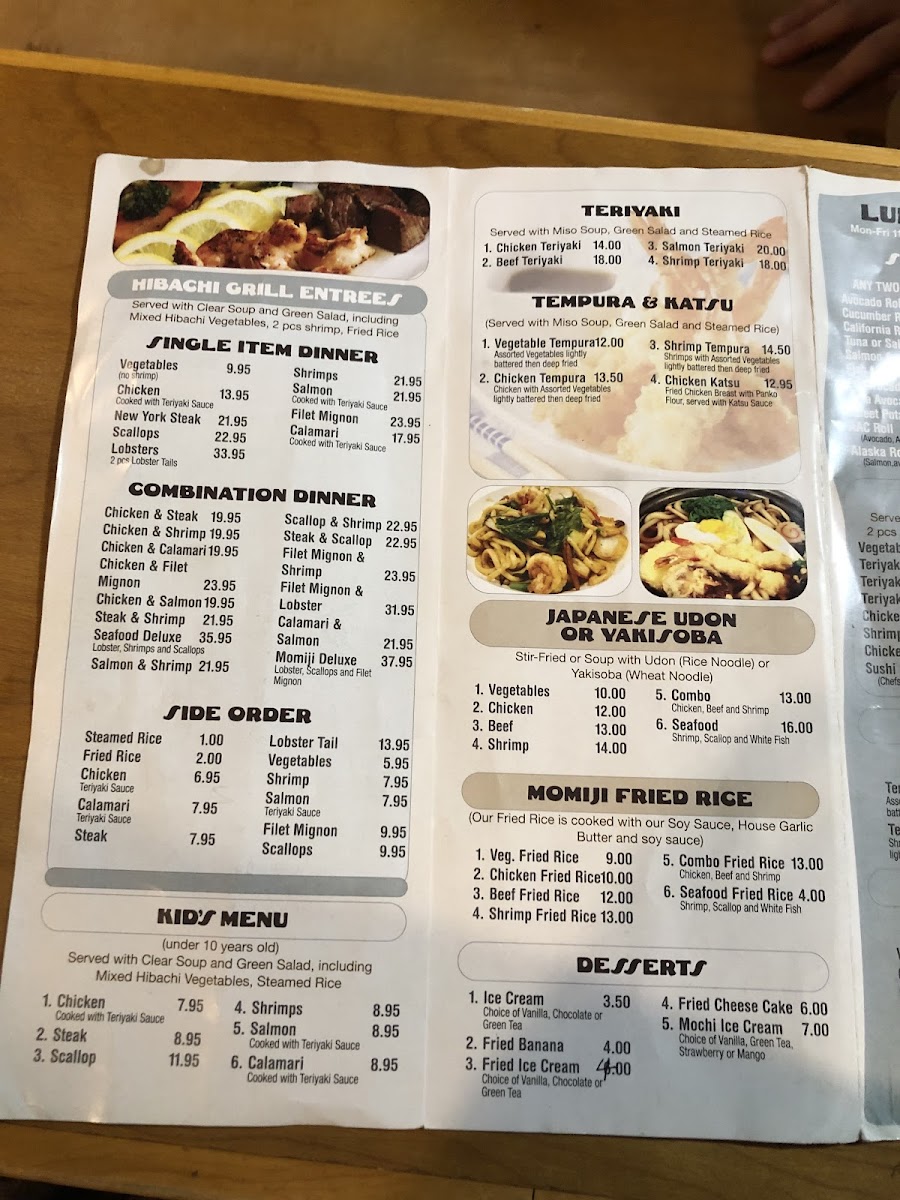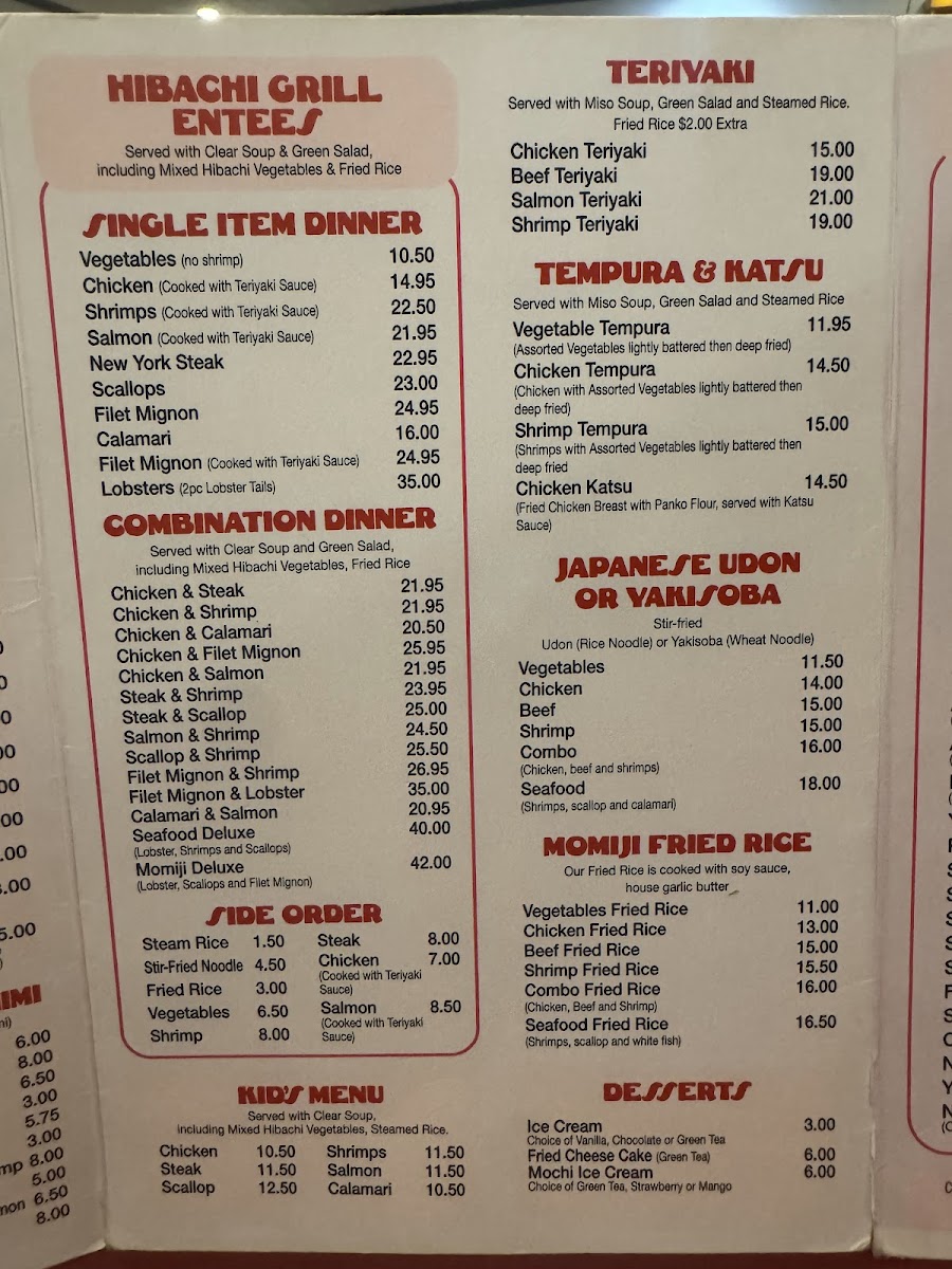 The menu also features a variety of side options, including perfectly cooked teriyaki chicken and succulent lobster tail, ensuring there’s something for everyone. The consistently high-quality dishes and attentive service create an inviting atmosphere that makes every visit special. Come indulge your senses at Momiji, where every bite tells a delicious story!